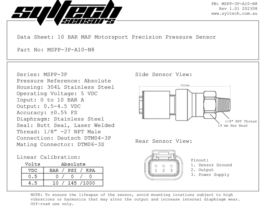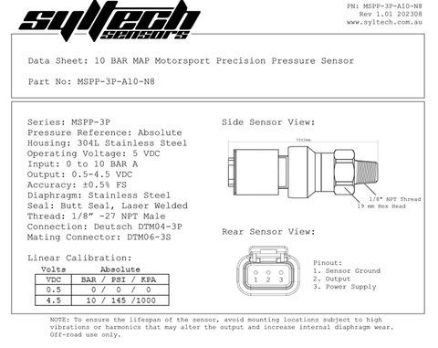 Utilizes a Stainless Steel Diaphragm in the sensor. All stainless body, dtm 3 pin connector and included calibrations for most ECUs + universal data for setup!